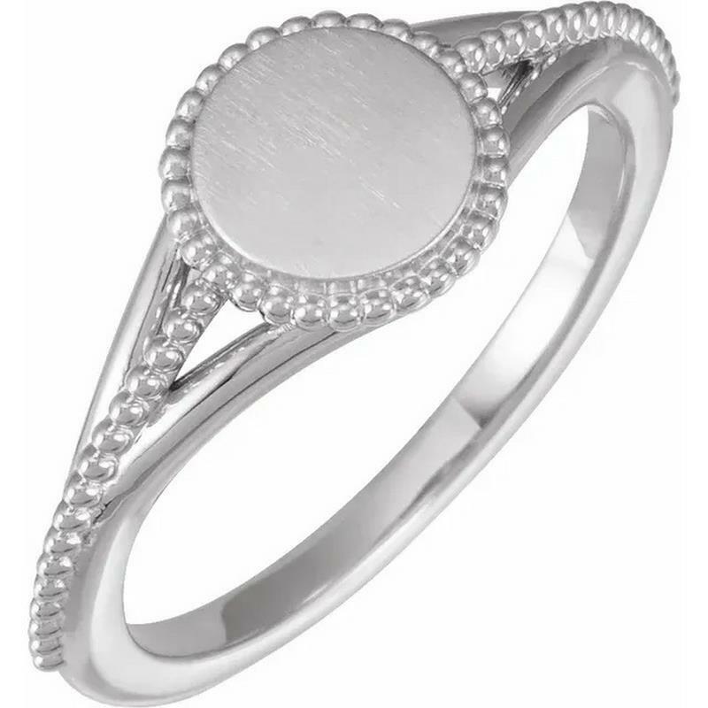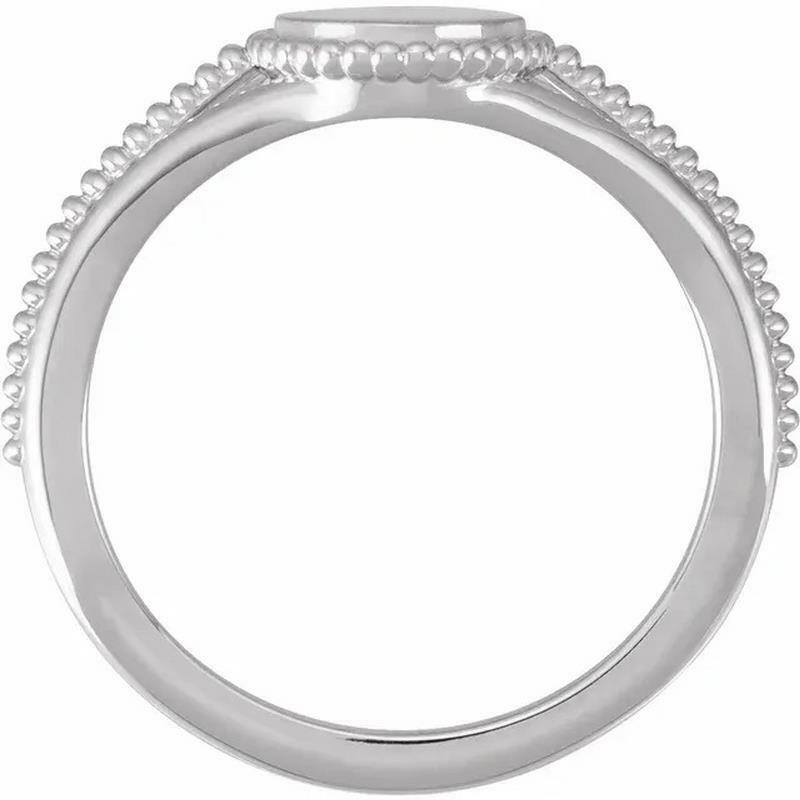 This beautiful 8.7 mm rhodium-plated 14k white gold engravable signet ring features a beaded design. Perfect as a Mother's Day gift.