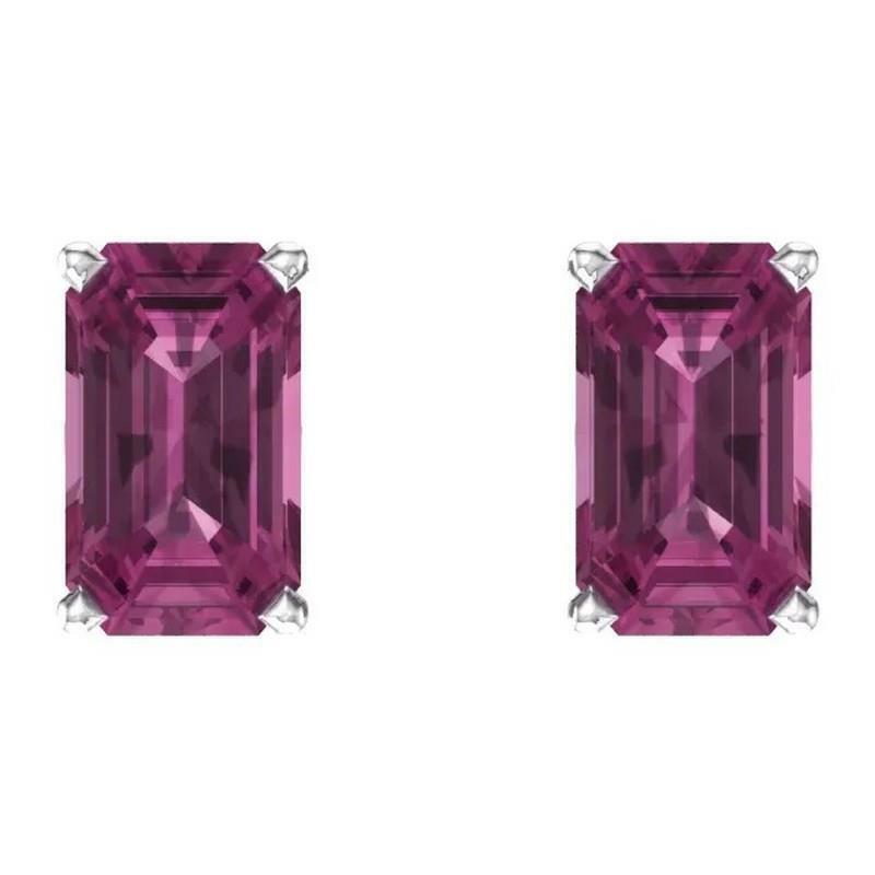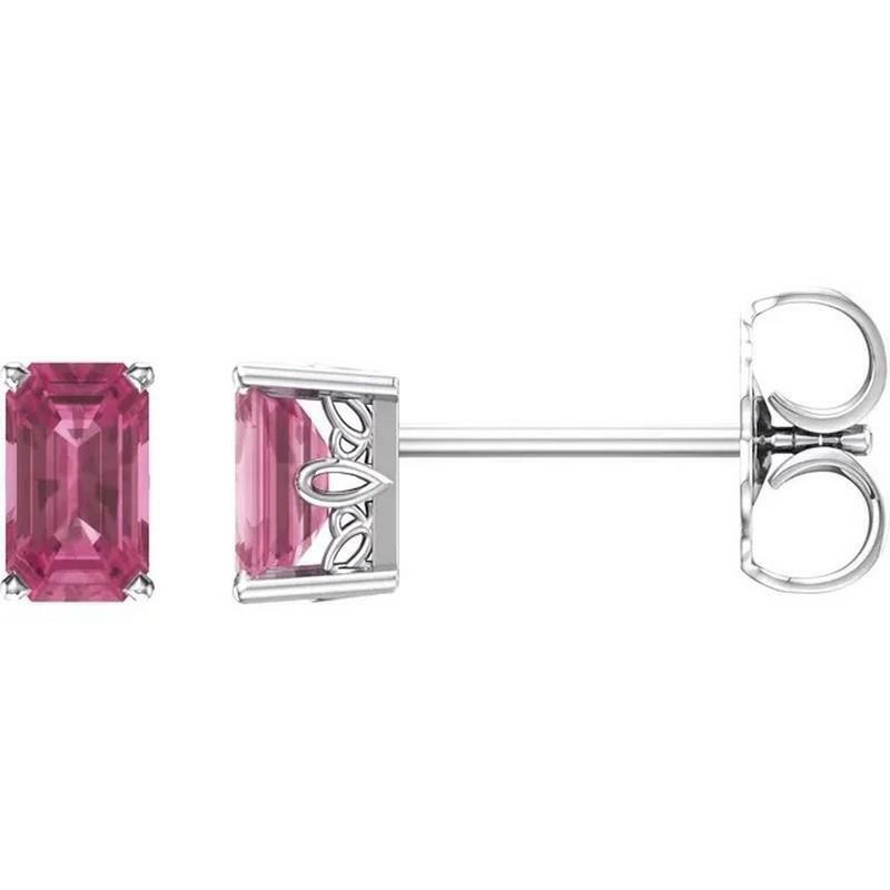 These 14k white gold stud earrings feature 2, 5 x 3 mm emerald shaped pink tourmaline gemstones. Secures with friction post and backs.