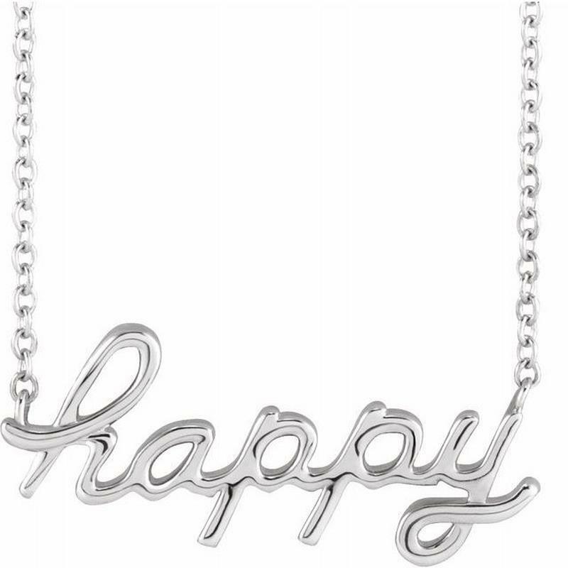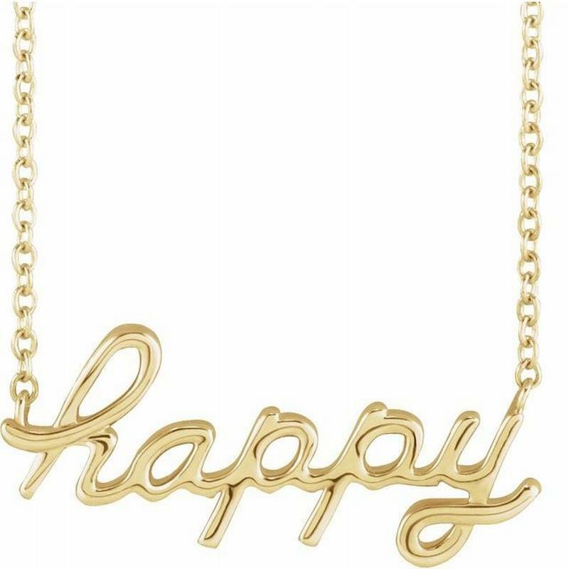 Crafted in 14k yellow, rose or rhodium-plated white gold this necklace features the message "happy" script. The necklace centre hangs on an 18-inch solid cable chain and secures with a spring-ring.