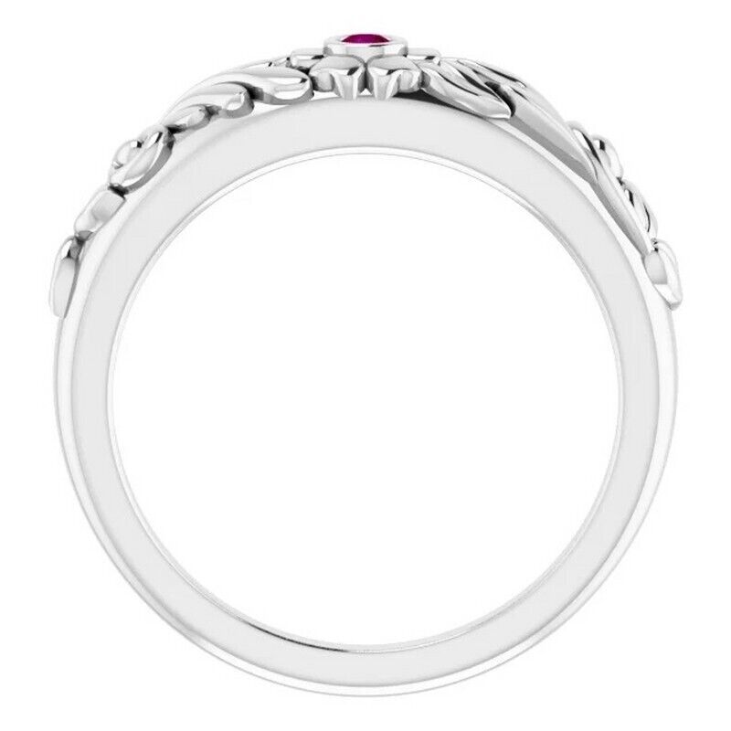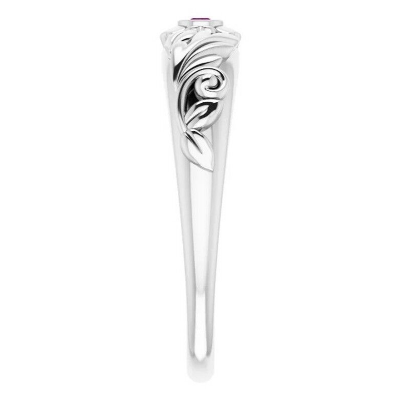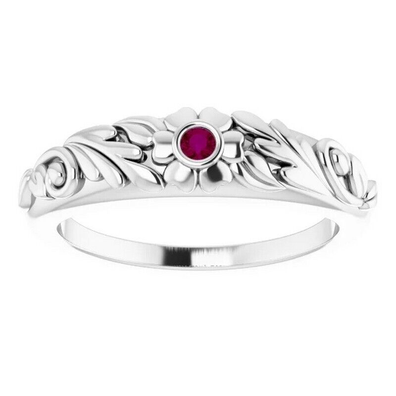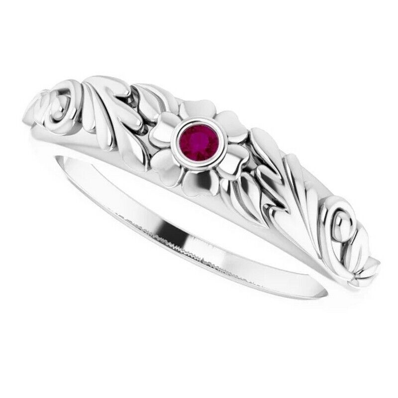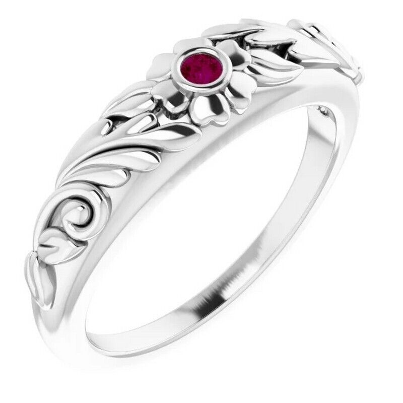 This platinum ladies ring features a beautiful floral pattern with a natural rhodolite solitaire solitaire.