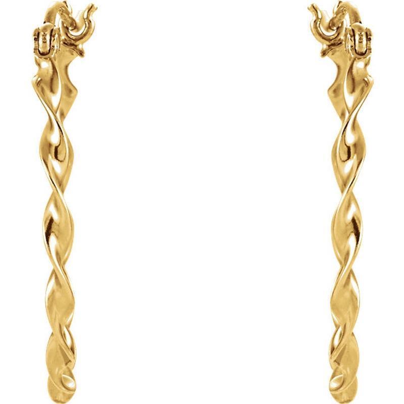 This 14k yellow gold twisted tube hoop earrings come in your choice of 12, 15 and 20 mm sizes to suit your fashion needs. Secures with hinged posts.
