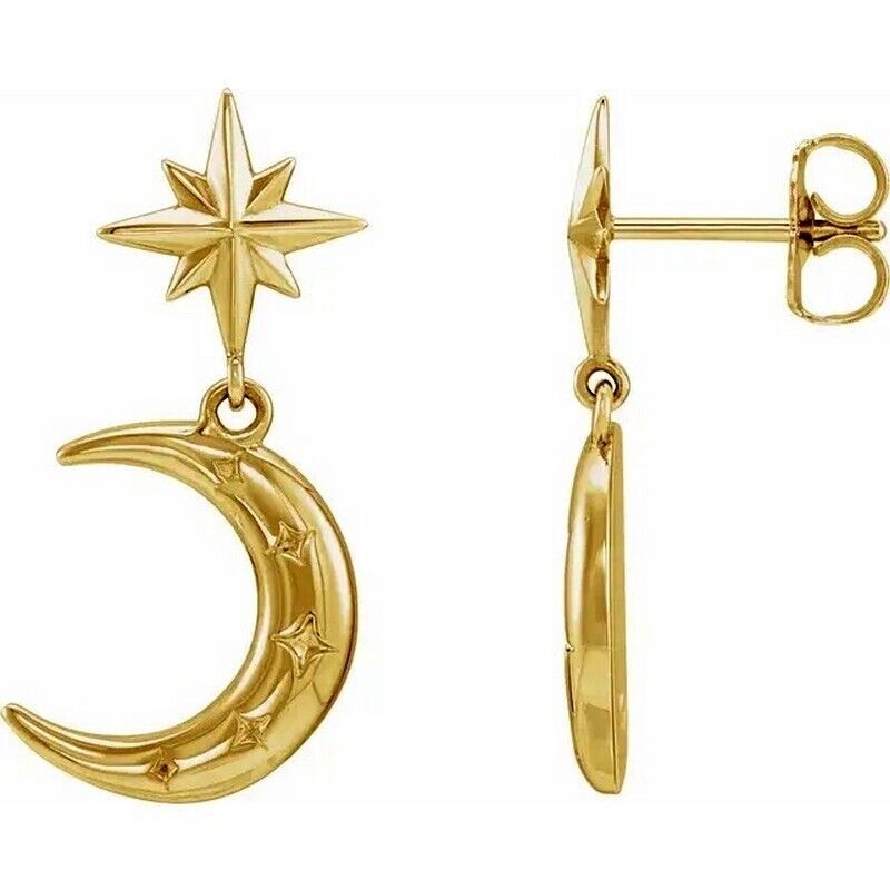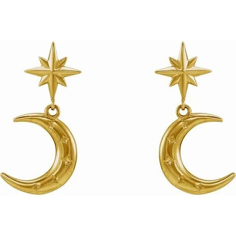 This beautiful pair of drop/dangle earrings features a crescent moon design in 14k yellow gold.