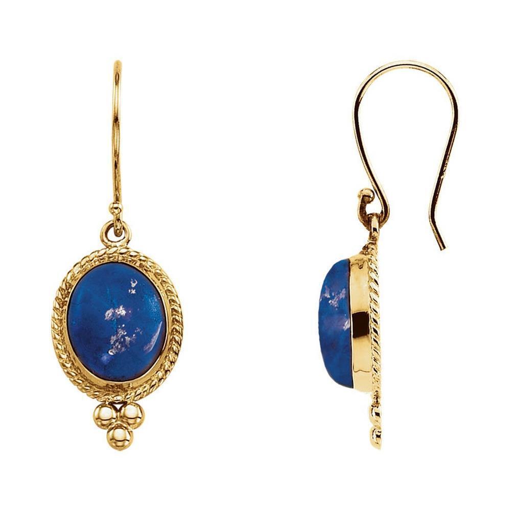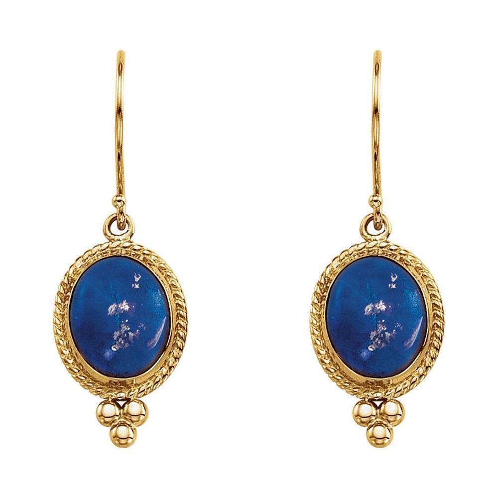 Product Description: These drop dangle earrings feature 2 oval cabochon lapis lazuli in 14k yellow gold.