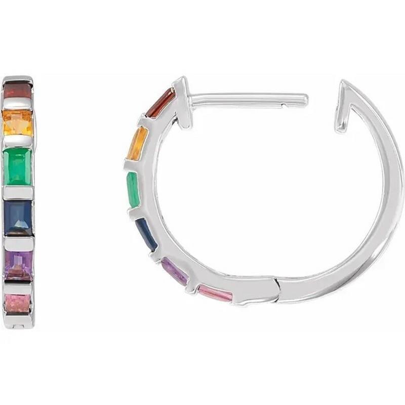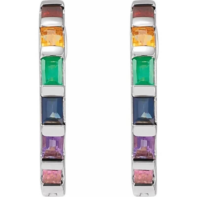 This pair of rhodium-plated 14k white gold multi-gemstone rainbow hoop earrings feature 12 straight baguette natural gemstones (each earring has 6 stones). The earrings are secured with hinged posts.
