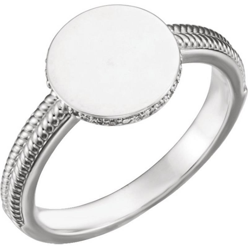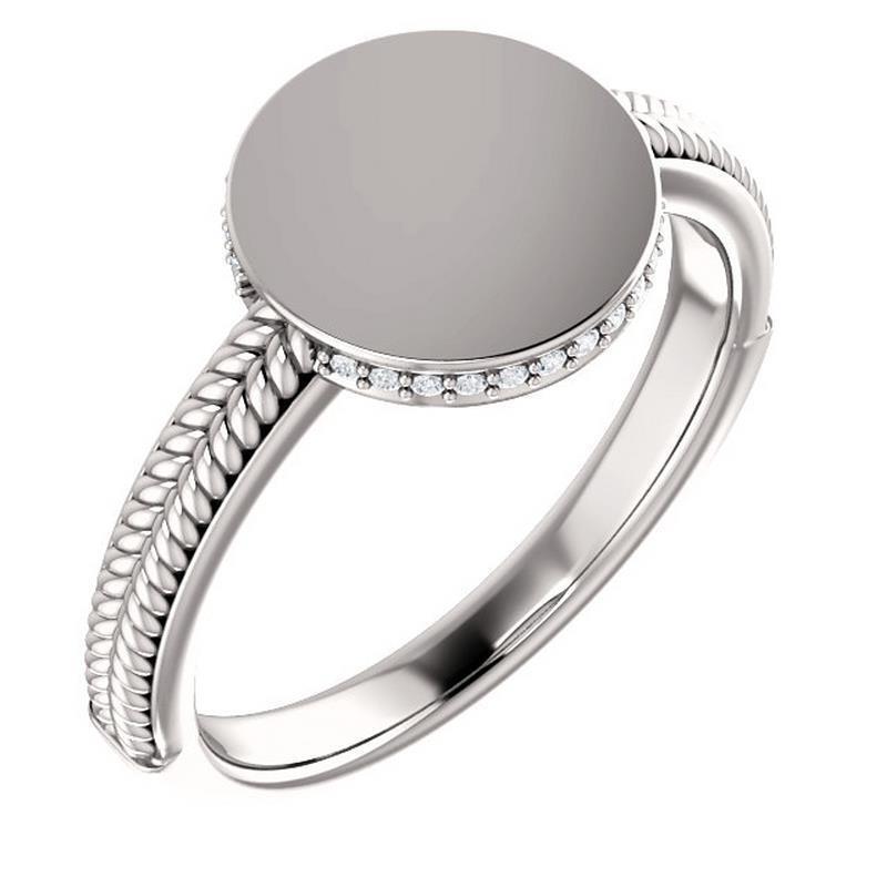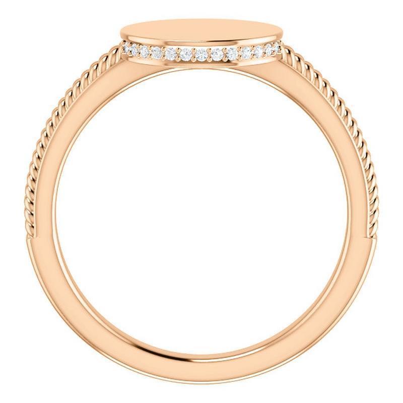 Crafted in your choice of 14k rose gold, 14k yellow gold or rhodium plated 14k white gold, this ladies' round signet ring features 26 round diamonds and rope details along the shank.