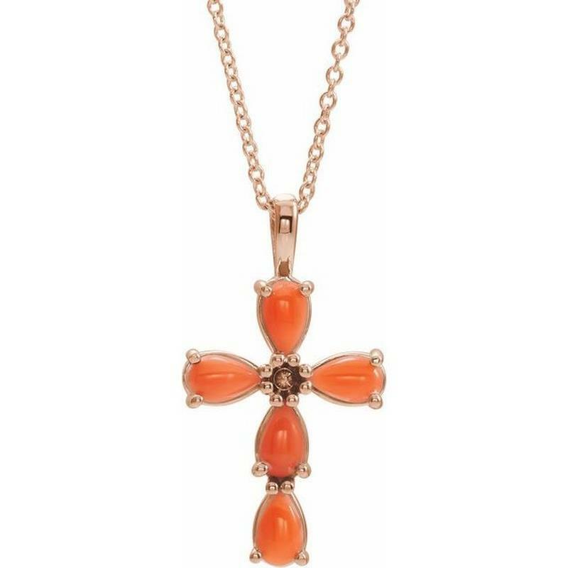 This 14k rose gold necklace features a cross with 5 pear-shaped cabochon pink coral stones. The cross hangs from a diamond-cut adjustable 16 to 18-inch cable chain and secures with a spring ring.