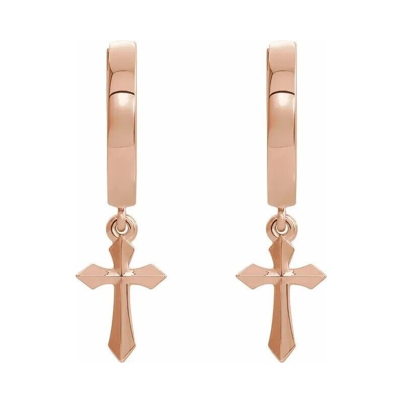 These 14k rose gold 20.1 mm hoop earrings feature cross dangles. The earrings are secured with hinged posts.