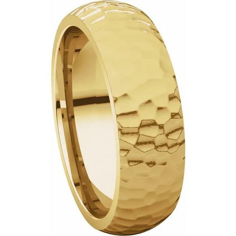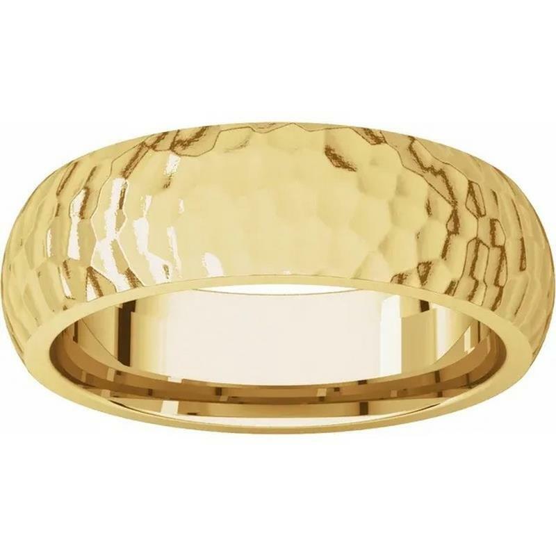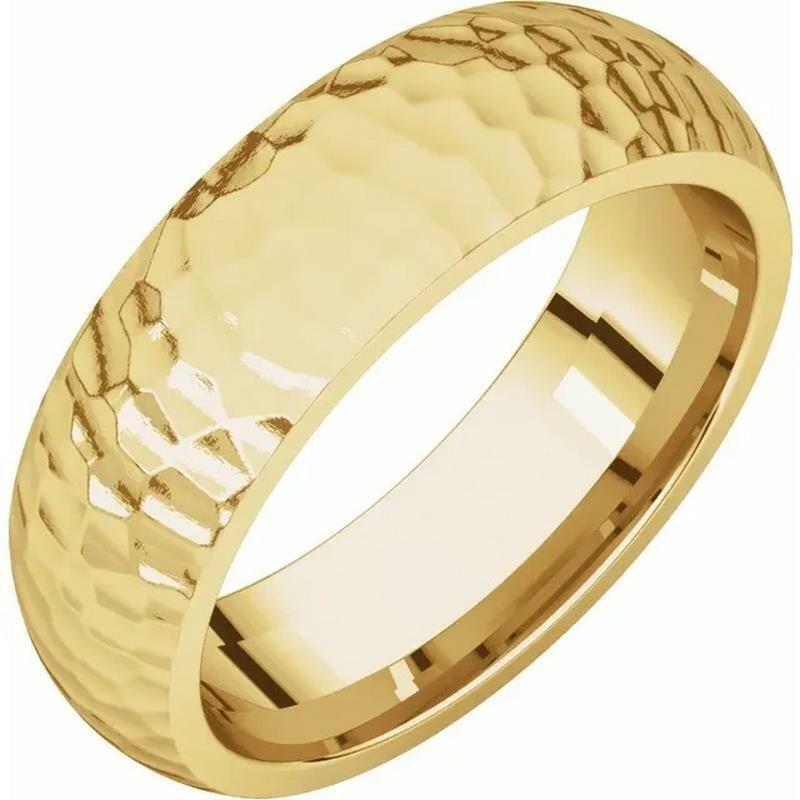 This 14k yellow gold 6 mm half round edge comfort fit wedding band features a beautiful hammer finish.