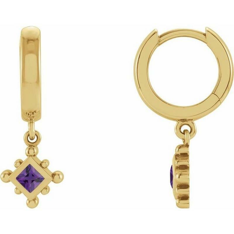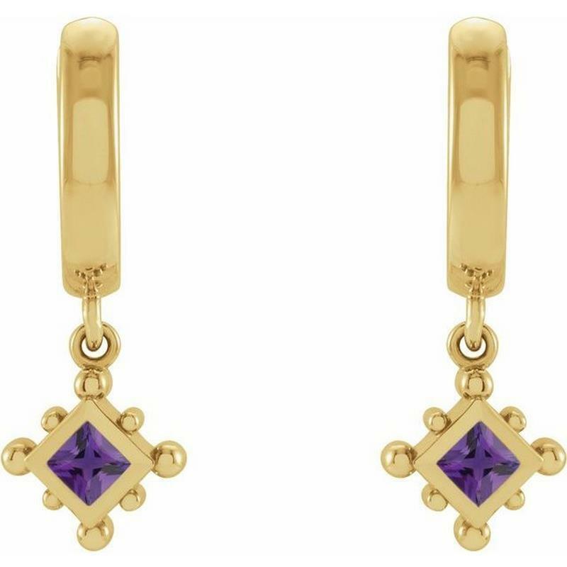 This pair of 14k yellow gold hoop earrings features 2 bezel-set princess shaped amethyst gemstones set in a beaded frame dangle. The earrings are secured with snap hinged posts.