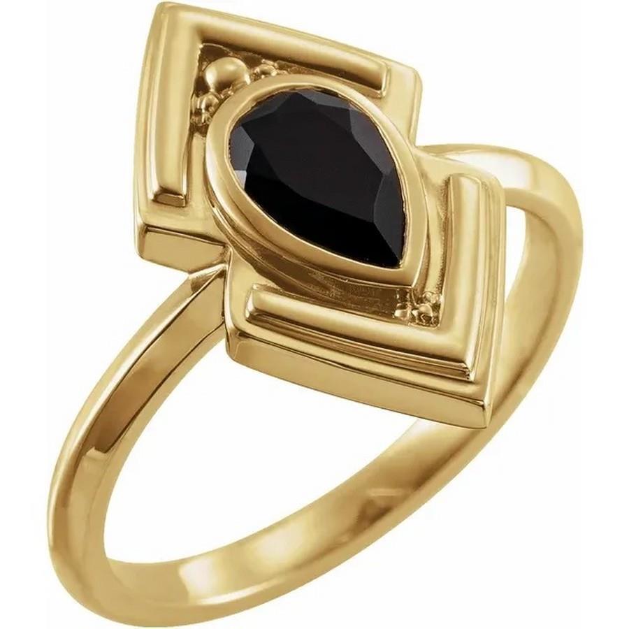 This beautiful 14k yellow gold art-deco style ring features a geometric design with an 8 x 5 mm, pear shaped, faceted black onyx.