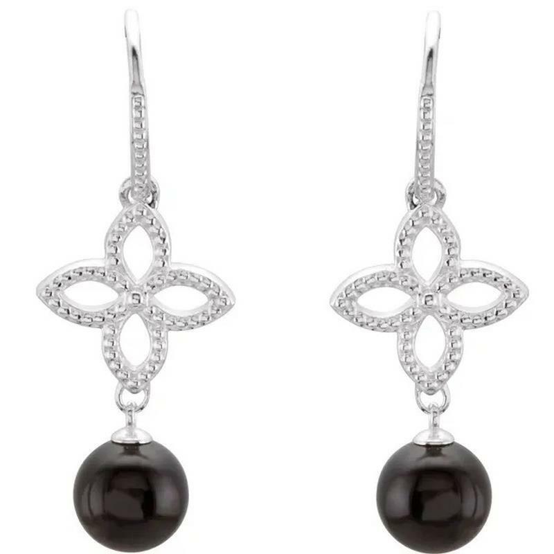 This beautiful pair of sterling silver drop/dangle earrings features a granulated floral-inspired design and two round 8 mm natural black onyx beads.