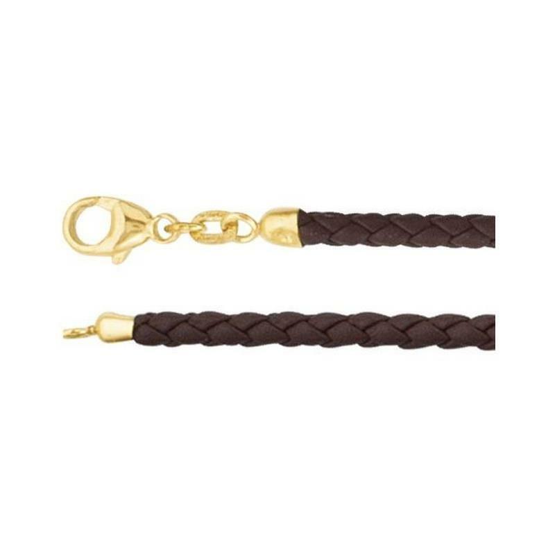 14k Yellow Gold Lobster Clasp 3 mm Brown Braided Leather Cord Necklace