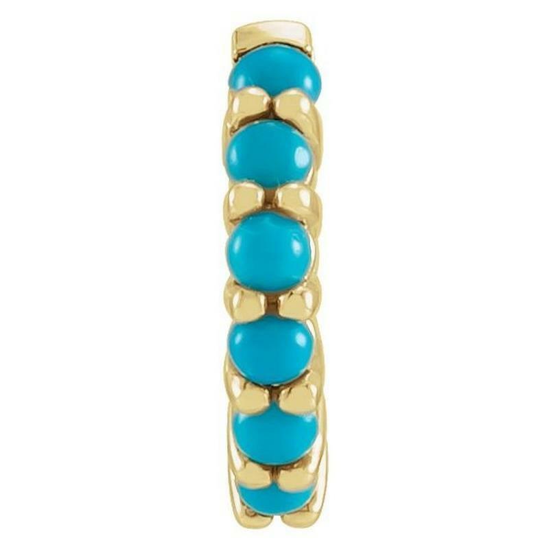 This single 14k yellow gold huggie hoop earring feature 6 round cabochon turquoise stones. The earring secure with a hinged post.