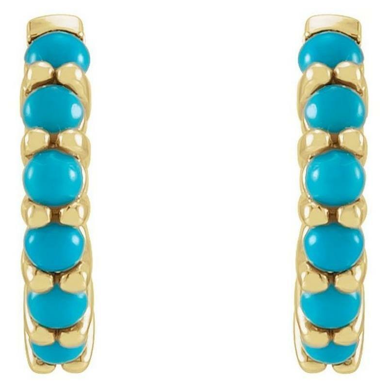 This pair of 14k yellow gold huggie hoop earrings features 12 round cabochon turquoise stones. The earrings secure with hinged posts.