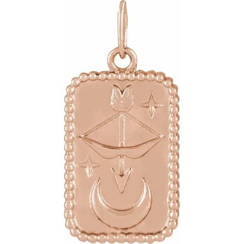 This 14k rose gold pendant features a bow and arrow celestial engraved images.