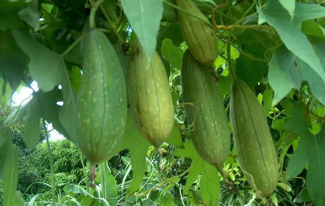 The Vietnamese Luffa gourd resembles a cucumber and its young fruit can be eaten. When larger it can be made into a bath or dish scrubbing natural sponge.