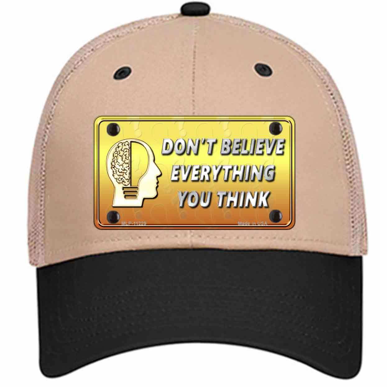 Dont Believe Everything You Think Novelty License Plate Hat. Show off your style with our mounted 4" x 2.2" metal patches on our 6 Panel SnapBack or Velcro Closer Hats. Choose between our different color and style caps. Our metal patches are made out of .025 grade aluminum and the designs are dye sublimated onto the metal to give a quality high gloss finish. Our metal patches are firmly attached using double cap rivets to give the patch an elegant tight fitting look!