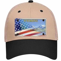 Wyoming State with American Flag Novelty Khaki Mesh License Plate Hat