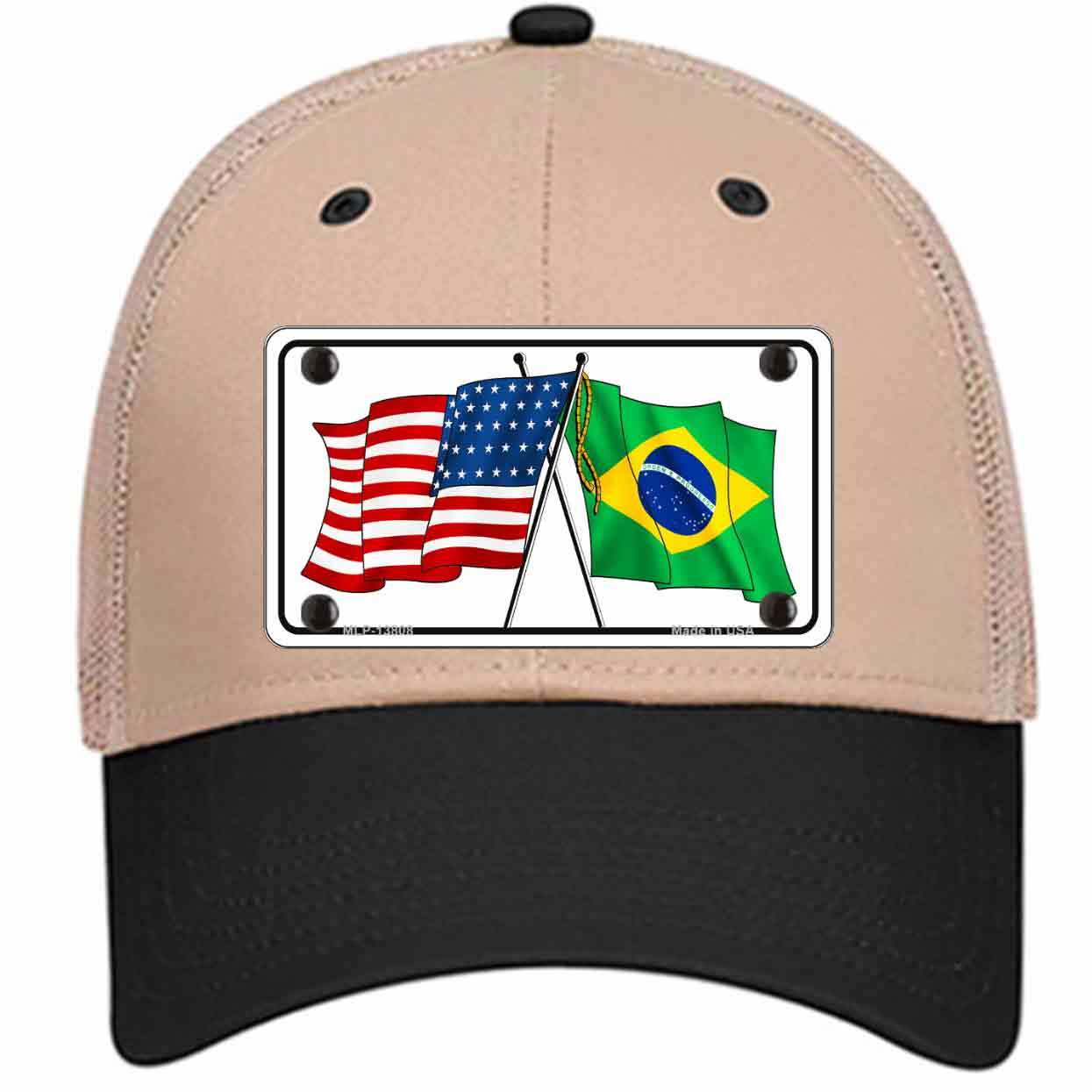 Brazil USA Crossed Flags Novelty Khaki Mesh License Plate Hat Tag