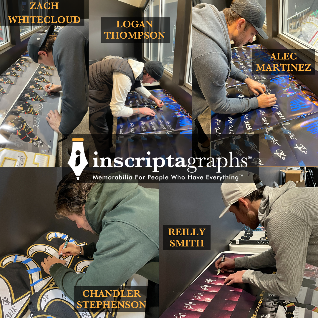 VEGAS FANS!! Check out this "Glow in the Dark" Vegas Golden Knights Reverse Retro 11" x 17" Game day Poster signed by Vegas Hockey star, Chandler Stephenson! This poster was handed out by the Knights at the game on December 9, 2022, vs. the Philadelphia Flyers! This product is part of Inscriptagraphs' exclusive "Glow in the Dark" Retro Autographed Memorabilia Collection inspired by the very first jersey to GLOW in the NHL! The poster itself actually glows in the dark, 1 of only 2 posters handed out by the Knights for all of their reverse retro themed games that actually glow and not simulated by graphics like their other 6 posters from other retro games. Chandler hand signed this poster towards the top right corner of the poster. When the autograph is in the light, it displays as a white colored signature, but when the lights turn off, and it has been activated by a source of light, the autograph will GLOW in the dark! To really bring the glow in the dark features out in the signature, it is best if it is activated with a black light, which is what you see in the lights out example photo of this listing. This item is authenticated by Inscriptagraphs Memorabilia and was signed by Chandler on January 18, 2023, at our private signing with him in Las Vegas. The actual Certificate is available on the Inscriptagraphs hologram database website that is indicated on the gold tamper-proof hologram on the item. This item will also include the paper certificate of authenticity card. You will enter the code number on the hologram of this item into our database and up will pop the certificate of authenticity for this item, forever. You can print out that document as proof of the authenticity of this collectible. Inscriptagraphs is proud to only authenticate items that are witnessed autographs amp; in the presence of a company representative. Will we authenticate 3rd party items based on an "opinion". Never do you have to worry about the authenticity of our collectibles as we pride ourselves in our secure state of the art, industry-leading authentication system. Note: This is a stock item where we are showing you a generic image of the item mentioned, although it may or may not be the exact one you will receive. The autograph amp; glow in the dark quality may vary from the photo pictured, as well as the location of the autographs. As a general statement, the poster condition you will receive is in very good shape with no tears whatsoever, but may have slight wrinkles or edges may have slight imperfections.