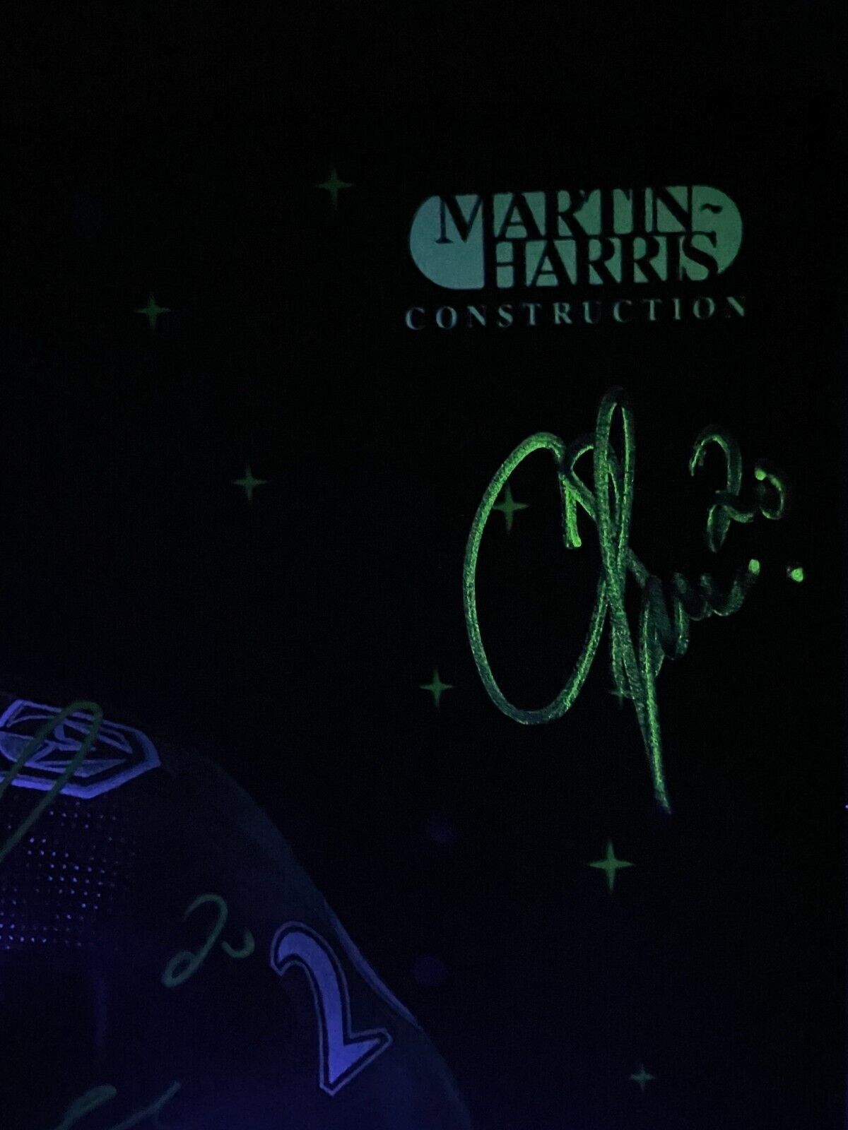 When the autograph is in the light, it displays as a white colored signature, but when the lights turn off, and it has been activated by a source of light, the autograph will GLOW in the dark! To really bring the glow in the dark features out in the signature, it is best if it is activated with a black light, which is what you see in the lights out example photo of this listing.