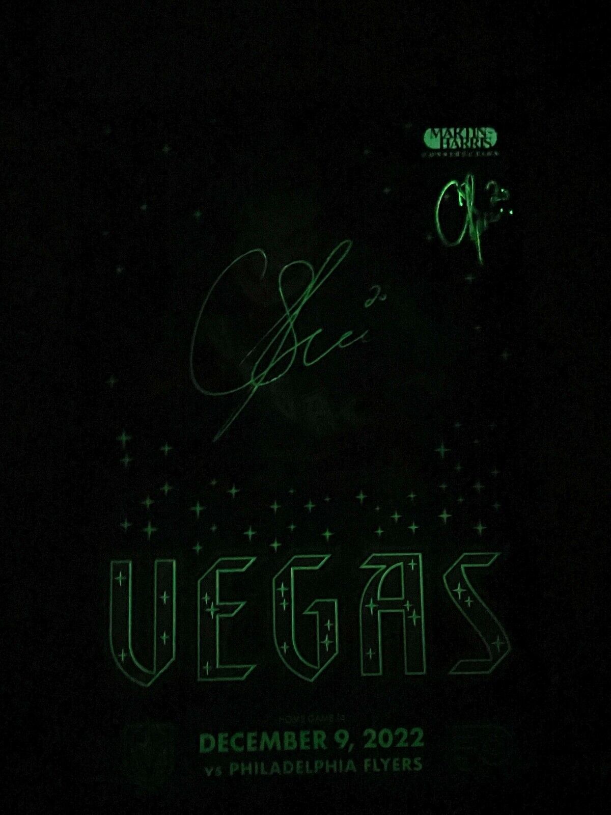 VEGAS FANS!! Check out this "Glow in the Dark" Vegas Golden Knights Reverse Retro 11" x 17" Game day Poster signed by Vegas Hockey star, Chandler Stephenson! This poster was handed out by the Knights at the game on December 9, 2022, vs. the Philadelphia Flyers! This product is part of Inscriptagraphs' exclusive "Glow in the Dark" Retro Autographed Memorabilia Collection inspired by the very first jersey to GLOW in the NHL! The poster itself actually glows in the dark, 1 of only 2 posters handed out by the Knights for all of their reverse retro themed games that actually glow and not simulated by graphics like their other 6 posters from other retro games. Chandler hand signed this poster towards the top right corner of the poster.