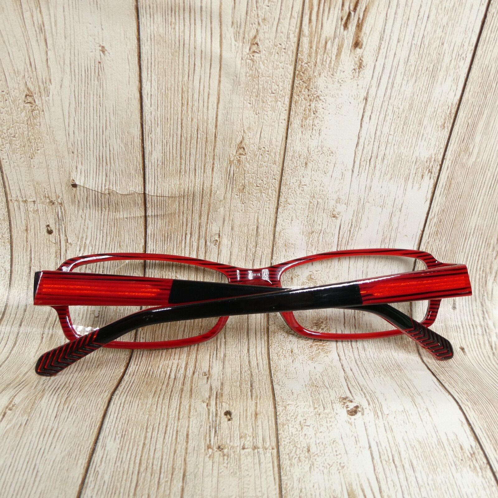 Gloss black and red eyeglass frames.