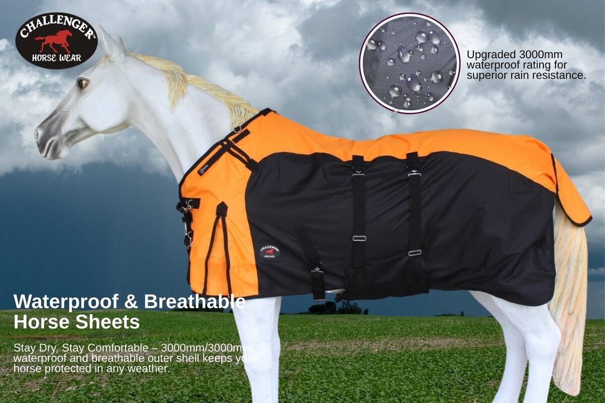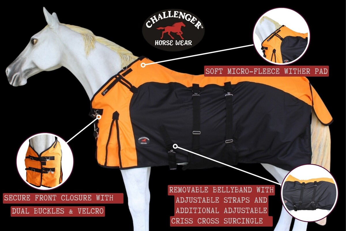 Challenger medium-weight horse blanket features a waterproof, breathable, and durable 1200D outer shell constructed with rip-stop weave fabric. Fleece lined underside to help keep your horse warm. The dual front buckle snap closure, cross surcingles, and elastic leg straps help secure blanket in place and ensure a comfortable fit. The reinforced, double-sewn stress points offer additional reinforcement to help prevent tears, while the fleece wither helps provide protection from rubbing. Shoulder gussets allow for freedom of movement. Tail cover provides additional protection from moisture. Hardware made of rust-free stainless steel.