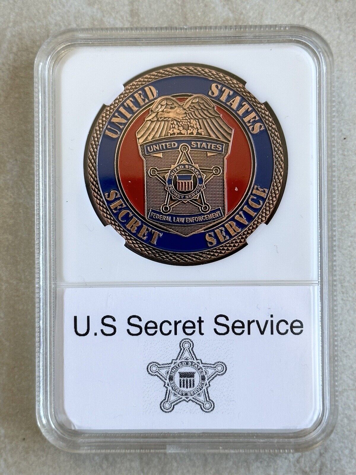 This is a great looking SECRET SERVICE shield challenge coin. Coin is about 1 9/16" in diameter and raised lettering and copper plated. Coin is contained in an acrylic air tight holder.
