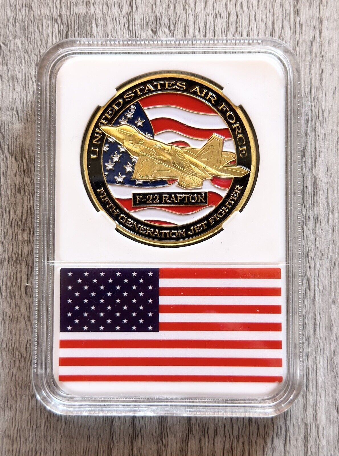 This is a great looking US AIR FORCE F-22 RAPTOR commemorative challenge coin. Coin has reeded edges and is about 1 9/16" in diameter. All details are raised lettering and gold plated. Coin is contained in an acrylic air tight holder.