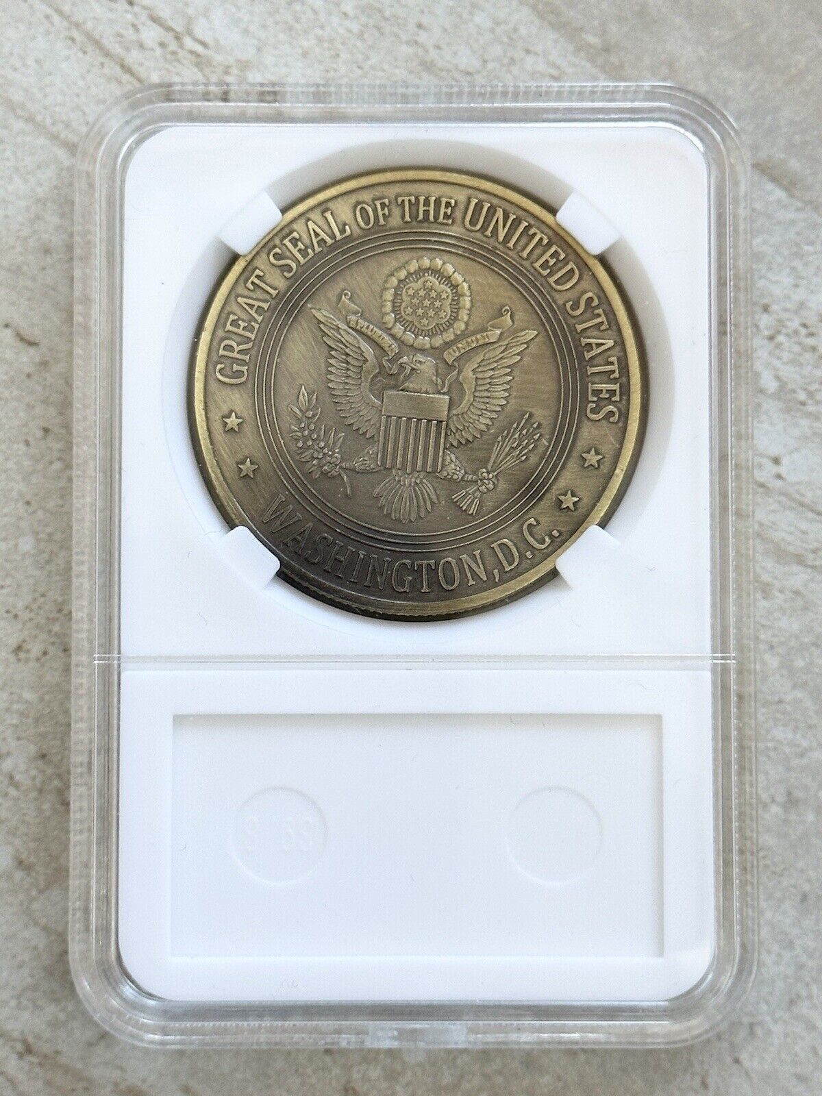 This is a great looking Dept of Justice Federal Bureau of Investigation ( FBI ) challenge coin. Coin is about 1 9/16" in diameter. This coin has the FBI logo on the front and the seal of the United States on the back. All details are raised lettering and gold plated. Coin is contained in an acrylic air tight holder.