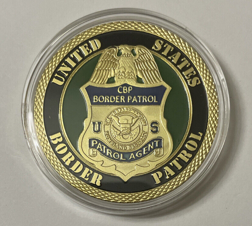 This is a great looking and colorful CUSTOMS AND BORDER PATROL challenge coin. Coin has reeded edges and is about 1 9/16" in diameter. All details are raised lettering and gold plated. Coin is contained in an acrylic air tight holder.