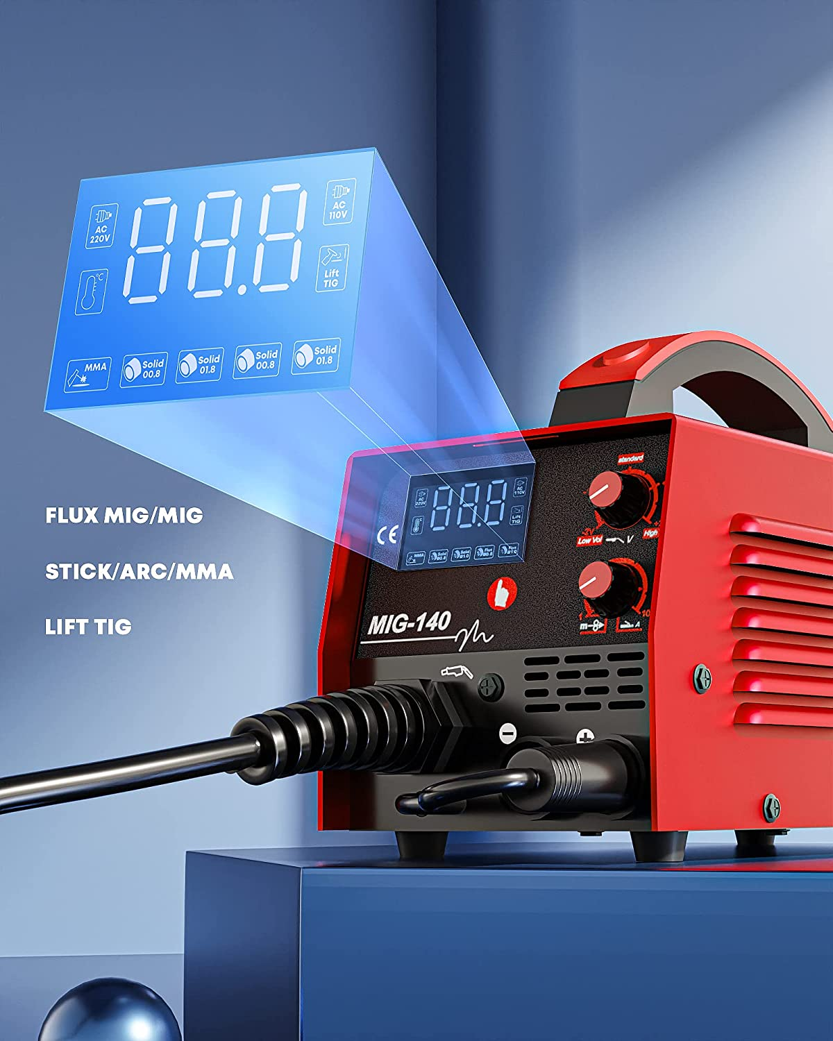 With voltage control knob and wire speed adjustment knob, you can easily adjust the current flow and wire feeding speed. The digital display can also help you set a suitable speed and current from 0-140A.