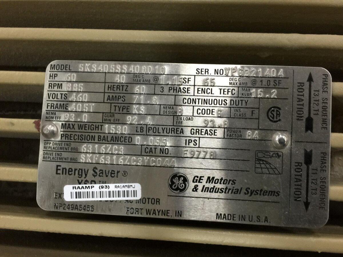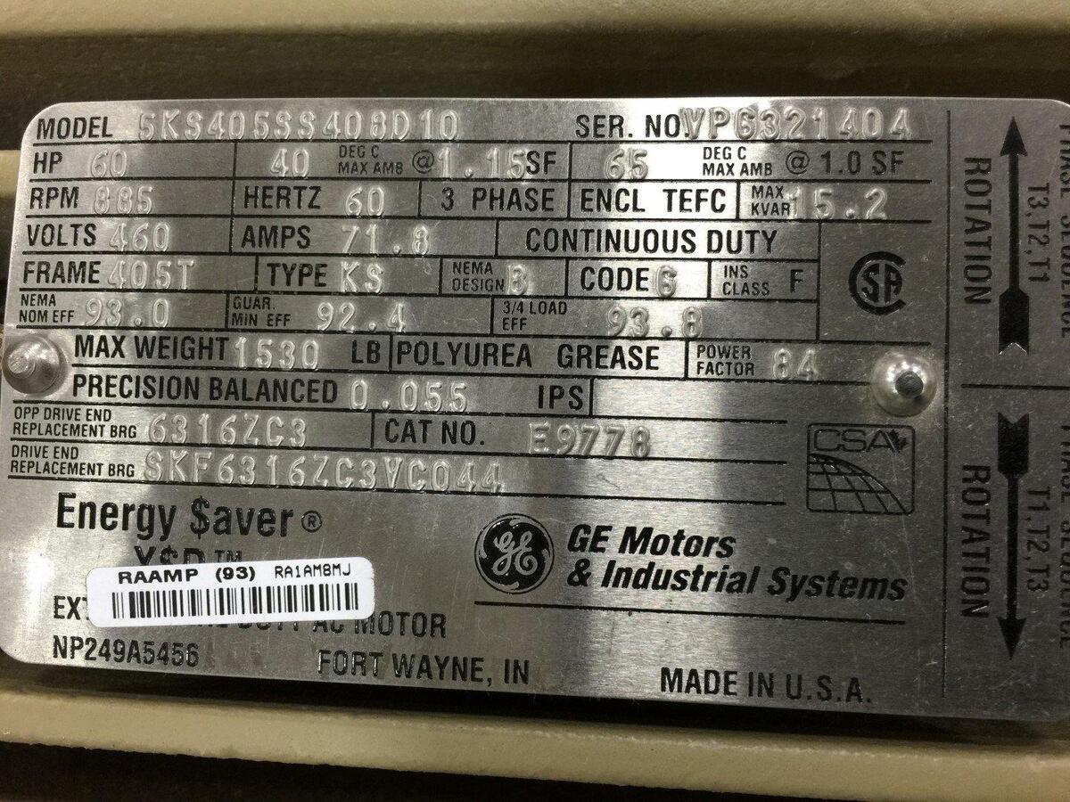 HP=60, RPM=885, HZ=60, 3 PHASE, MAX KVAR=15.2, VOLTS=460, AMPS=71.8, CONTINUOUS DUTY, FRAME=405T, TYPE=KS, NEMA DESIGN=B, CODE 6, INS CLASS F, NEMA NOM EFF=93, GUAR MIN EFF=92.4, 3/4 LOAD EFF=93.8, MAX WEIGHTS 1530 LBS, POLYUREA GREASE, POWER FACTOR=84, PRECISION BALANCED 0.055 IPS, CAT NO: E9778