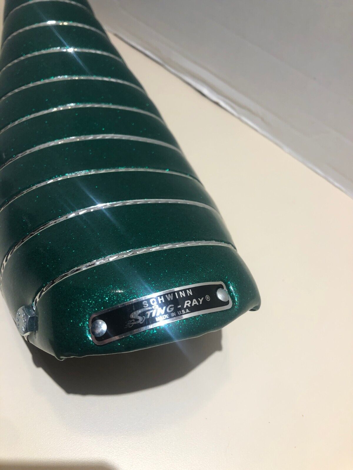 SCHWINN 1968 Green Glitter STING-RAY SEAT full size 18 inch length. Permaco Seat from 1999.