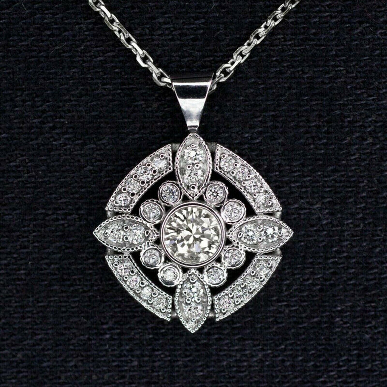 2Ct Round Cut Diamond Art Deco Pendant Women's 14K White Gold Plated Free Chain