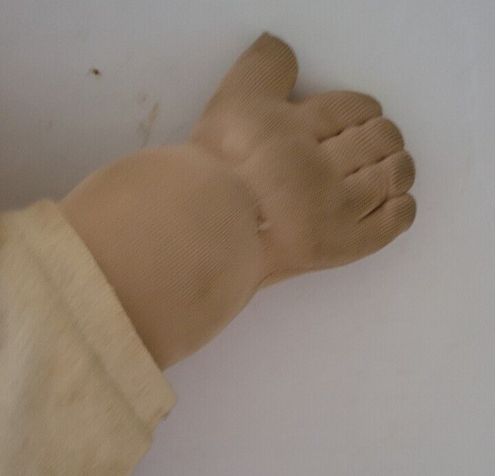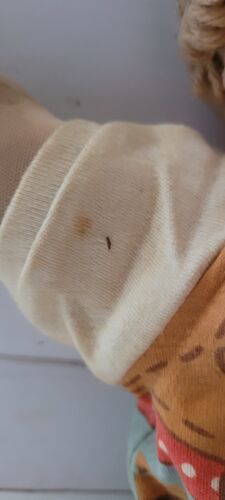 This doll is in decent used condition. The doll is soiled as seen in the photos. The outfit is in good condition. There are no holes that I found in it or the doll. It would make a nice addition to a collection.