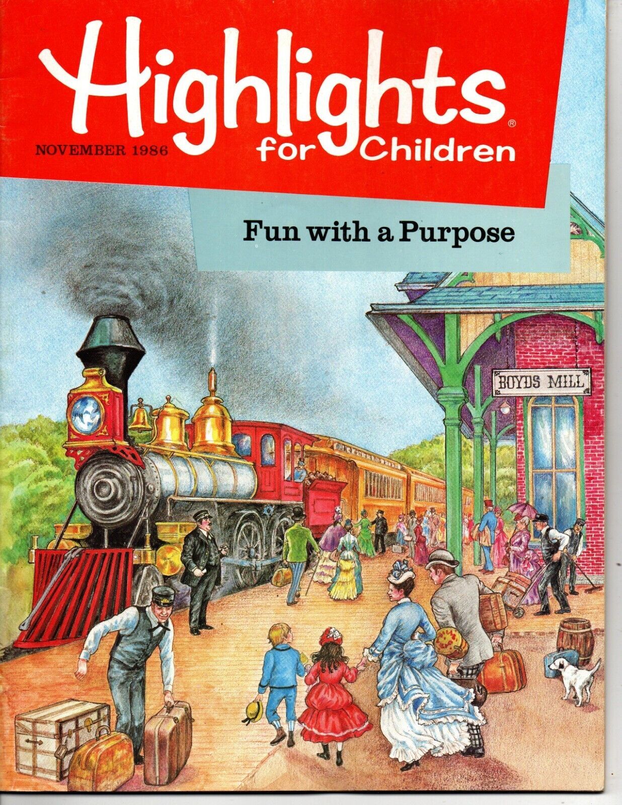 This is an original copy of Highlights for Children Magazine. This is the November 1986 issue. The cover has minor shelf wear. The pages are clean. The back cover has a small tear and so do pages 41/42 in the same area. See photos 2-6. All other pages and the front cover are ok.