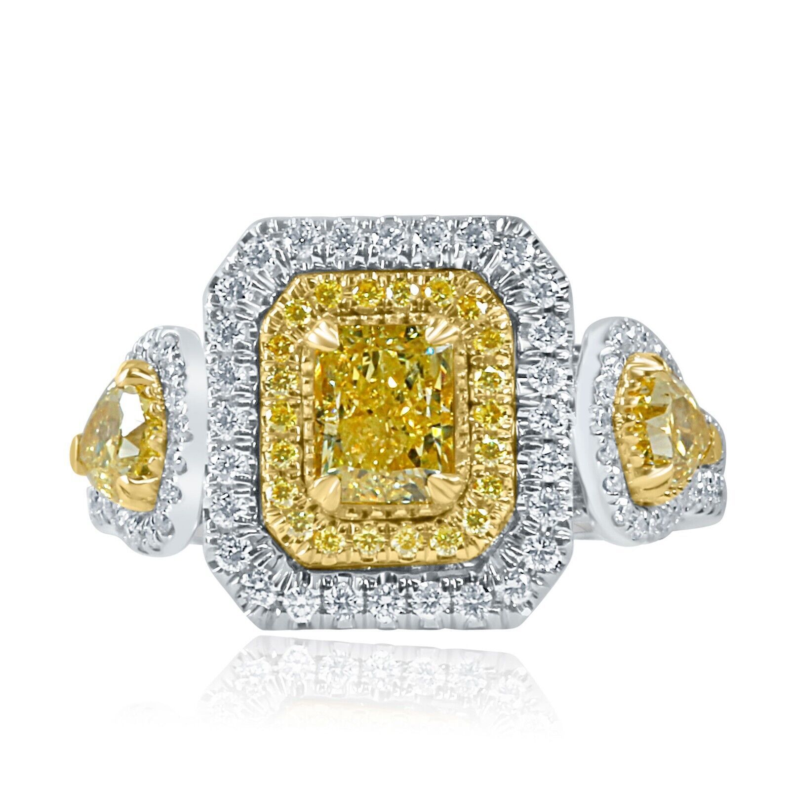 Not many rings will get as much attention as this sparkler. The center diamond is a 0.72 carat GIA certified radiant brilliant cut natural fancy yellow diamond encircled with a double halo for extra sparkle!!! Flanking the radiant center stone, two exquisite 0.66 carat kite brilliant cut natural fancy yellow diamonds enhance the overall presentation, ensuring that this ring is impossible to overlook!!! The shank, crafted from 18-karat white gold, not only adds to the ring's charm but also features additional diamonds that gracefully flow down its sides. To further enhance the beauty of the center diamond, it has undergone a clarity treatment, ensuring that every facet shimmers with exceptional radiance. The ring comes with Gemological Institute of America Certificate (GIA) # 2225728109