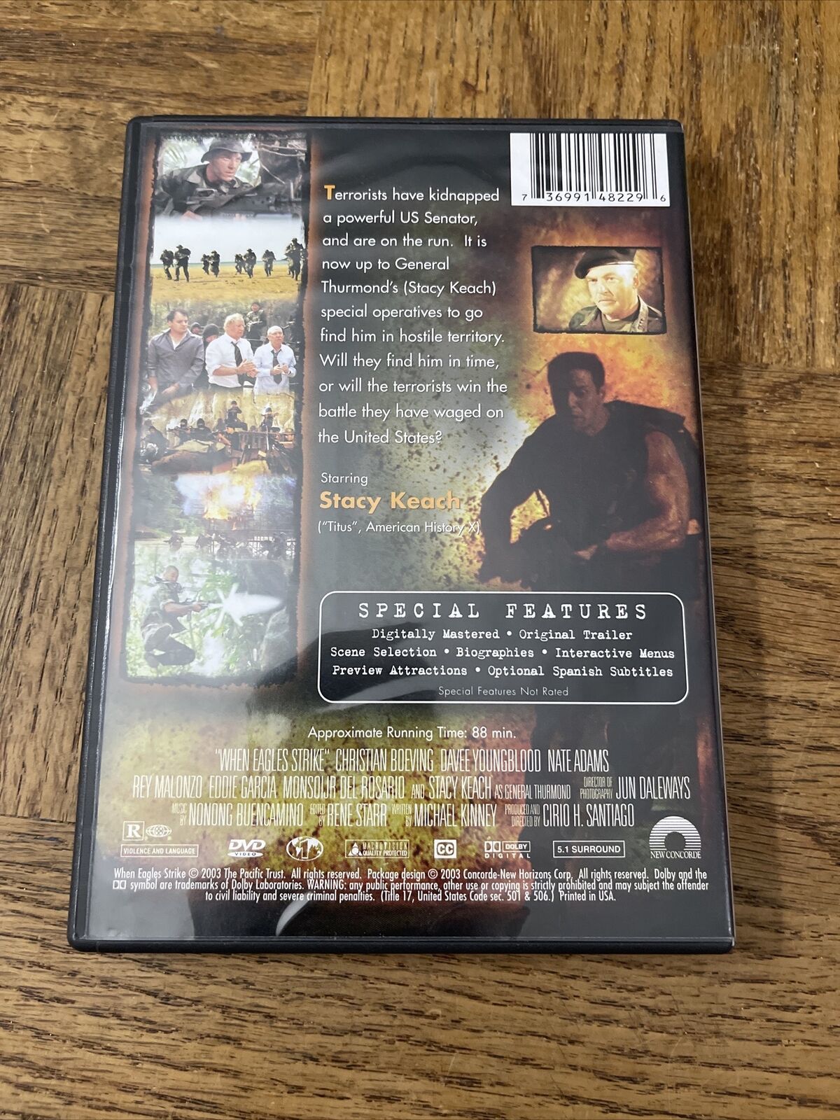 Get ready for non-stop action and adventure with the When Eagles Strike DVD. This DVD promises to keep you on the edge of your seat with its thrilling storyline and heart-stopping scenes. In this action-packed movie, you'll follow a team of brave soldiers as they face their greatest challenge yet. With a rating of R, this movie is perfect for adult viewers who love a good adrenaline rush.