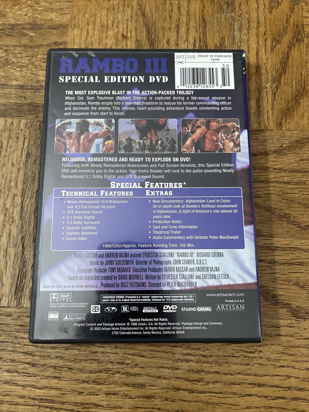 Experience the thrilling action and adventure of Rambo III with this special edition DVD. Directed by Peter Macdonald, this R-rated film follows the heroic John Rambo as he embarks on a dangerous mission in Afghanistan.