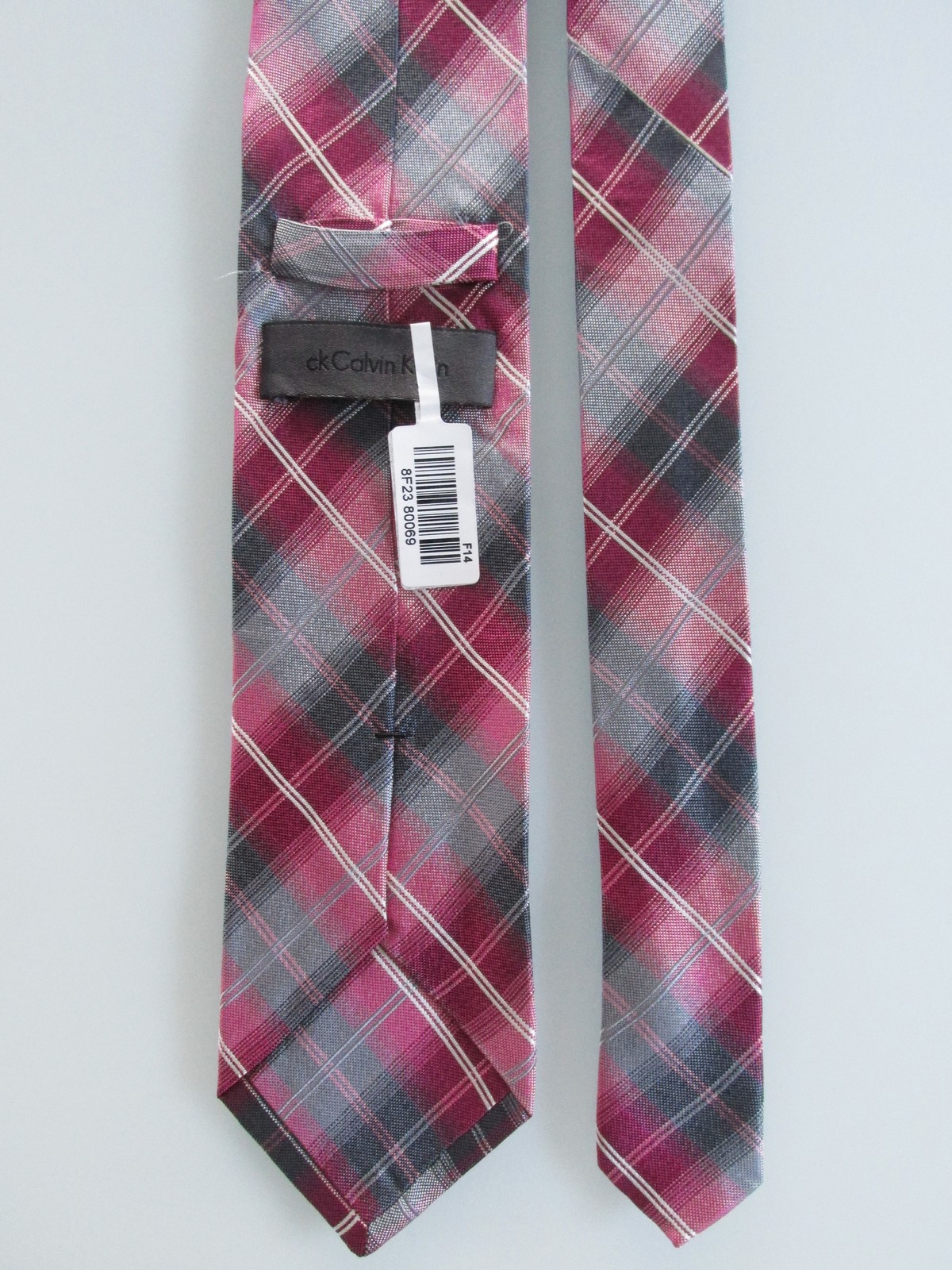 Description: Up for sale is a Calvin Klein (NWT) men's slim silk tie. This tie is made of 100% silk. The tie has a multicolored plaid pattern in shades of pink, gray, with white accents. Dimensions are approximately 59" long x 3 1/8" wide. This tie has the original $65.00 price ticket attached.