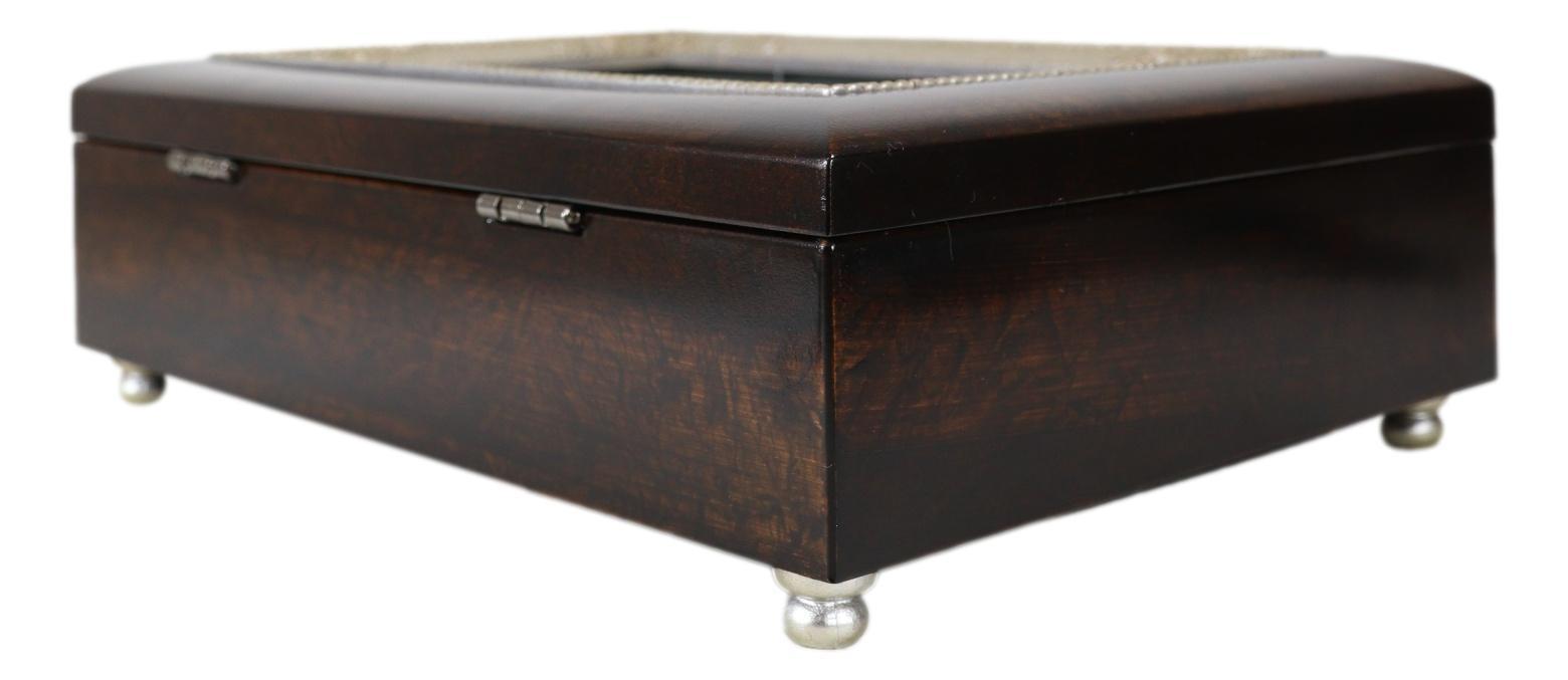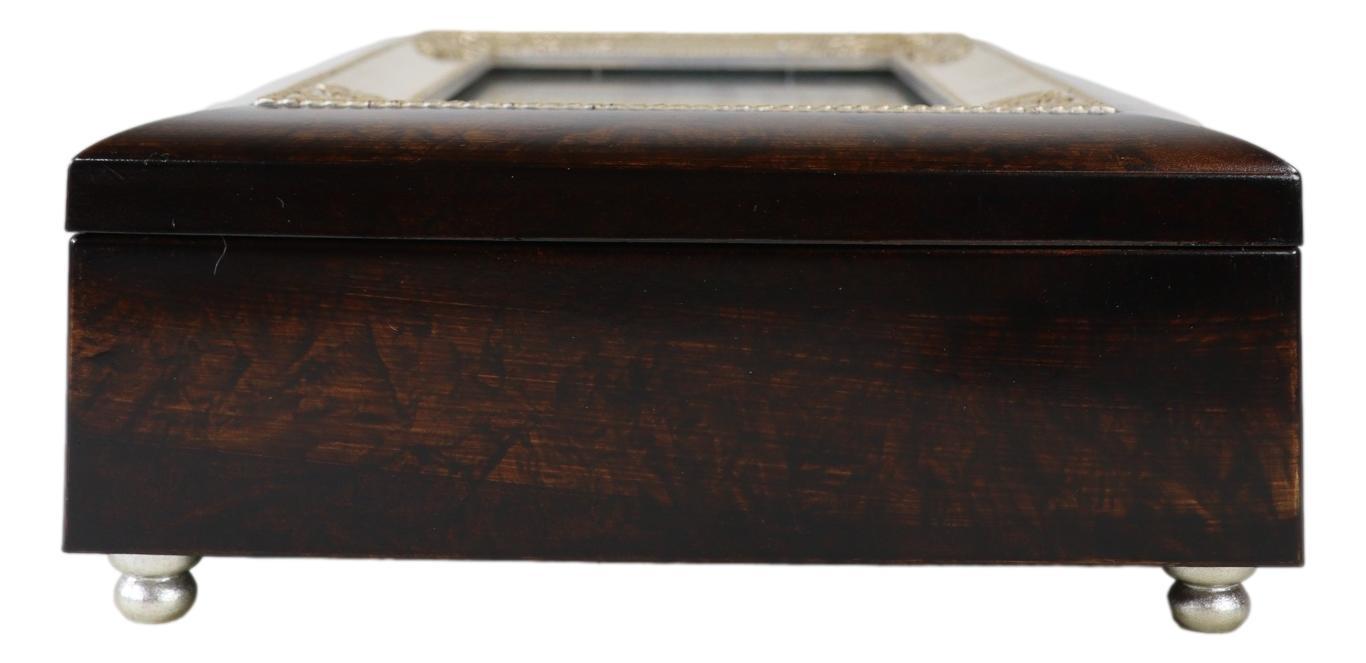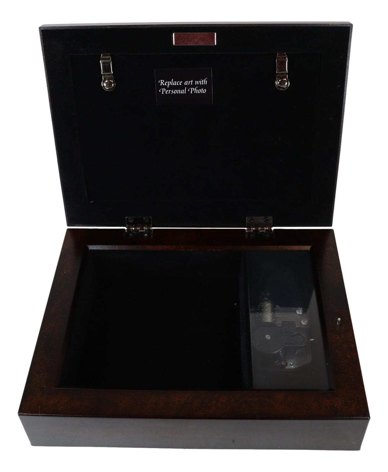 ? This Inspirational Anniversary Musical Trinket Box is made of high quality burlwood. Box is lined with protective rich velvet and padded feet. Quality hinges keep the lid upright when opened. Comes in nice packaging for easy wrapping. Quality Sankyo Musical Mechanism plays unique song under the protective glass inside the box.