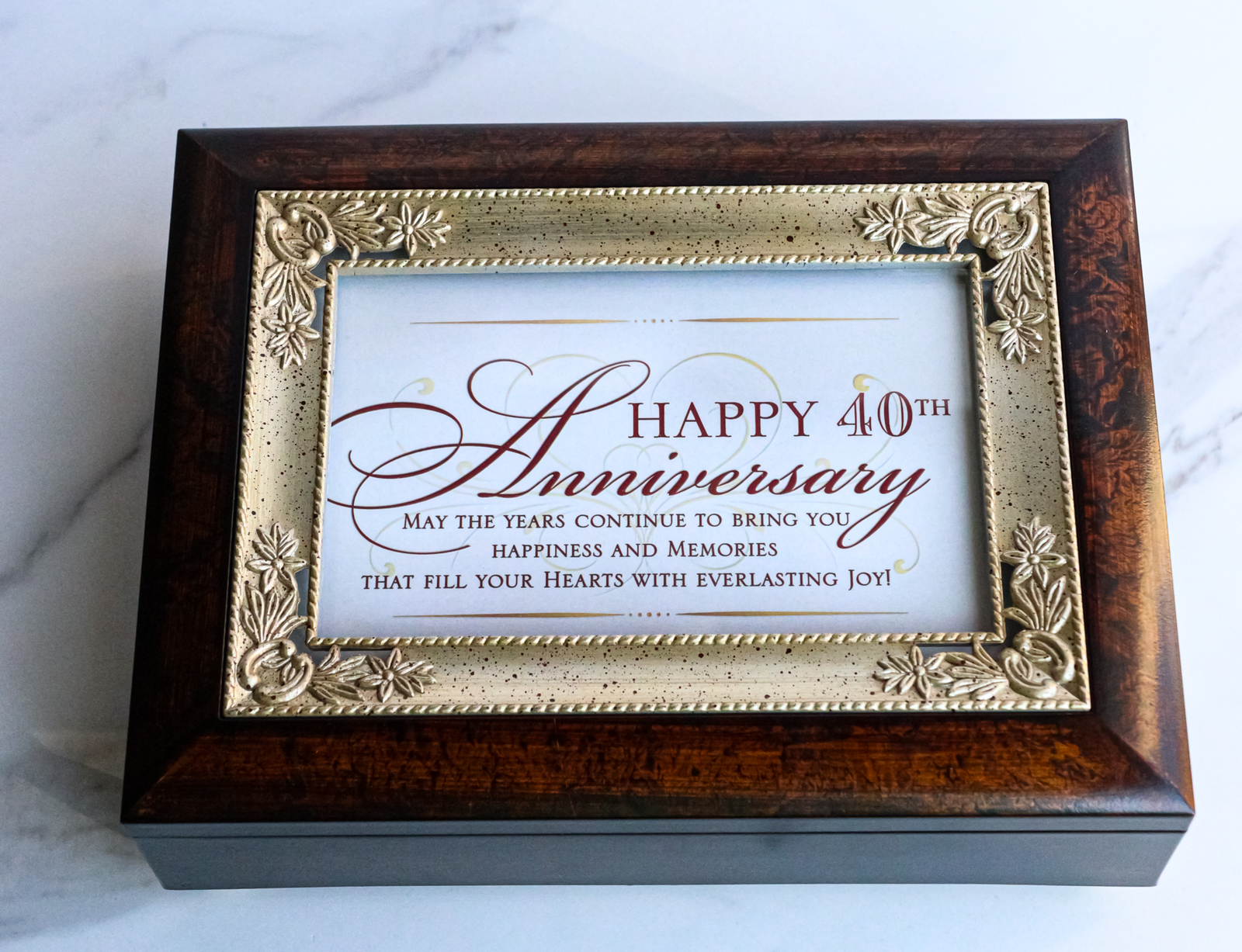 Happy 40th Anniversary Burlwood With Silver Scrollwork Musical Trinket Box