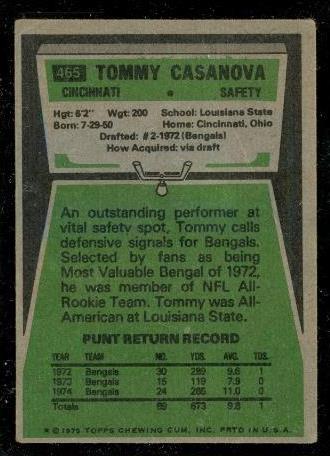 Vintage Football Card 1975 Topps #465 Tommy Casanova Cincinnati Bengals Safety
