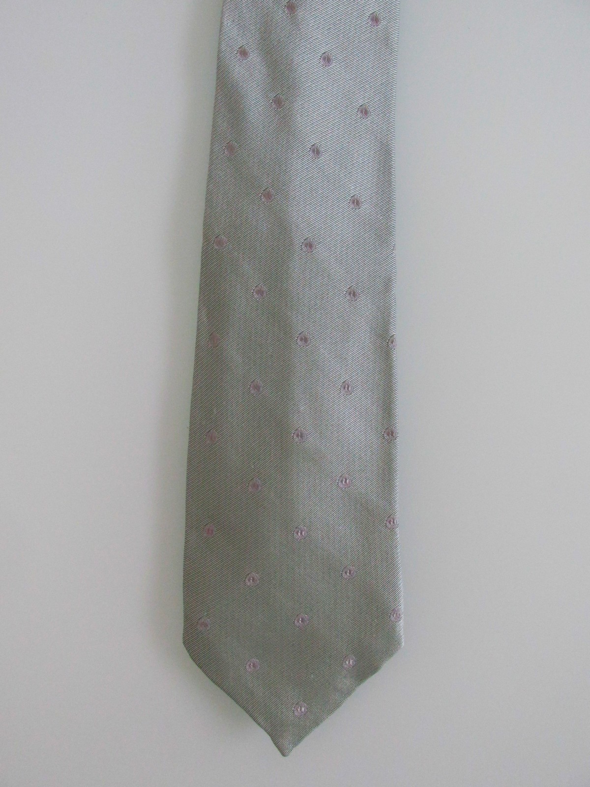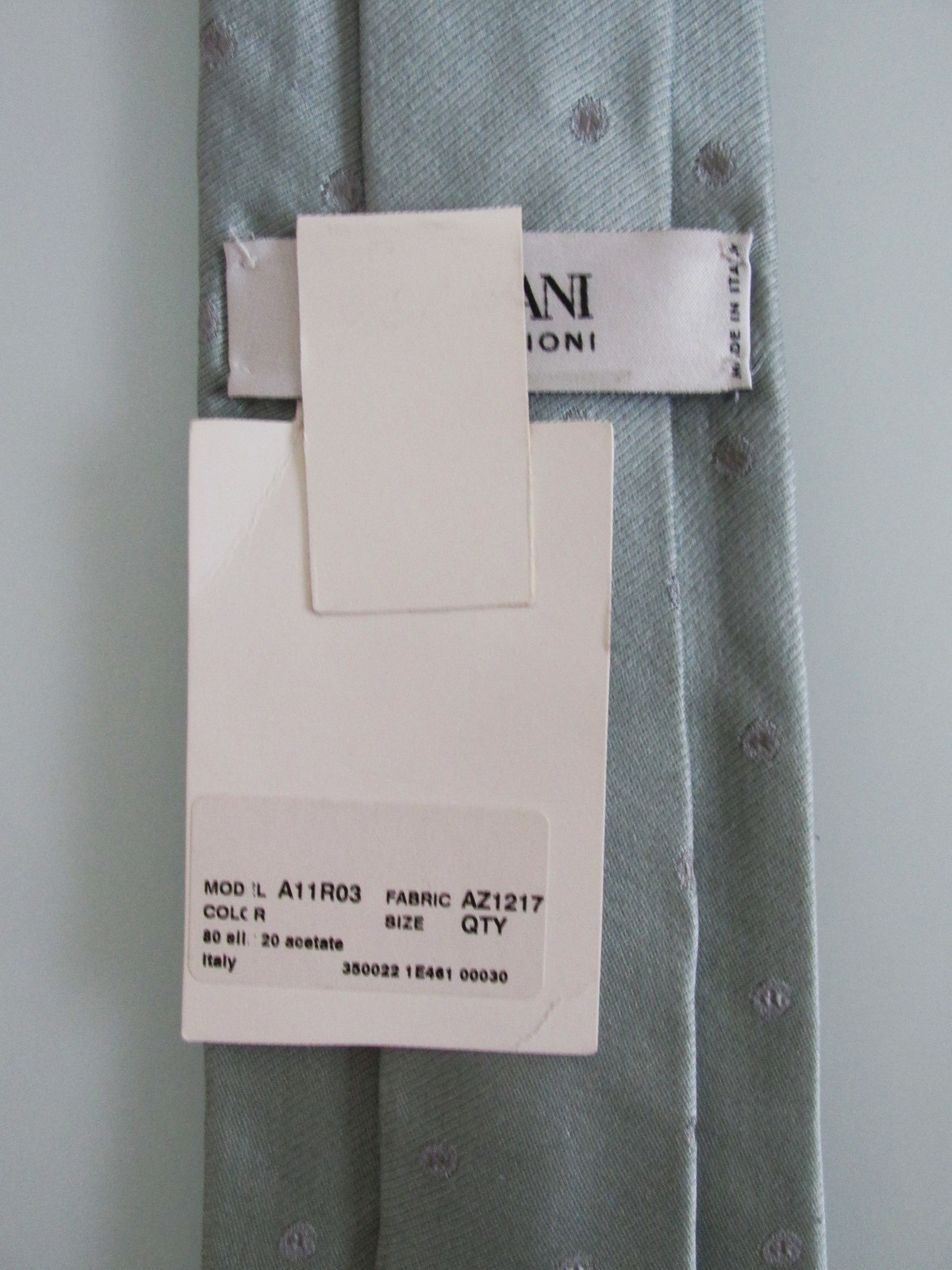 Description: Up for sale is a Giorgio Armani (NWT) men's silk tie. The tie is made in Italy of 100% silk. The tie has a light silver-like color polka dot pattern on a very pale pastel green background. The dimensions are approximately 57" long x 3 1/8"