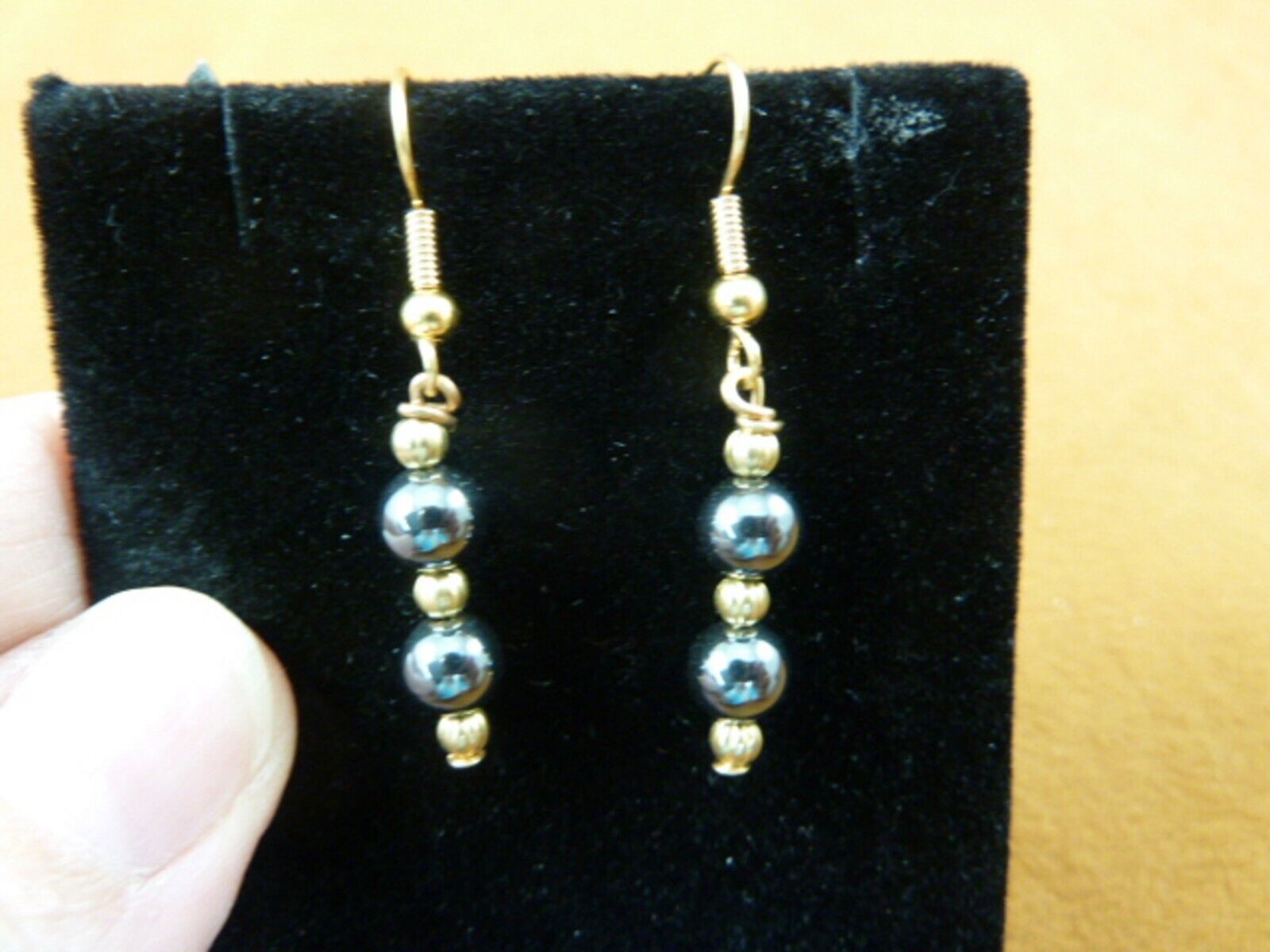 EE-380-10) 6mm round Black hematite + gold tone bead pair wire dangle EARRINGS