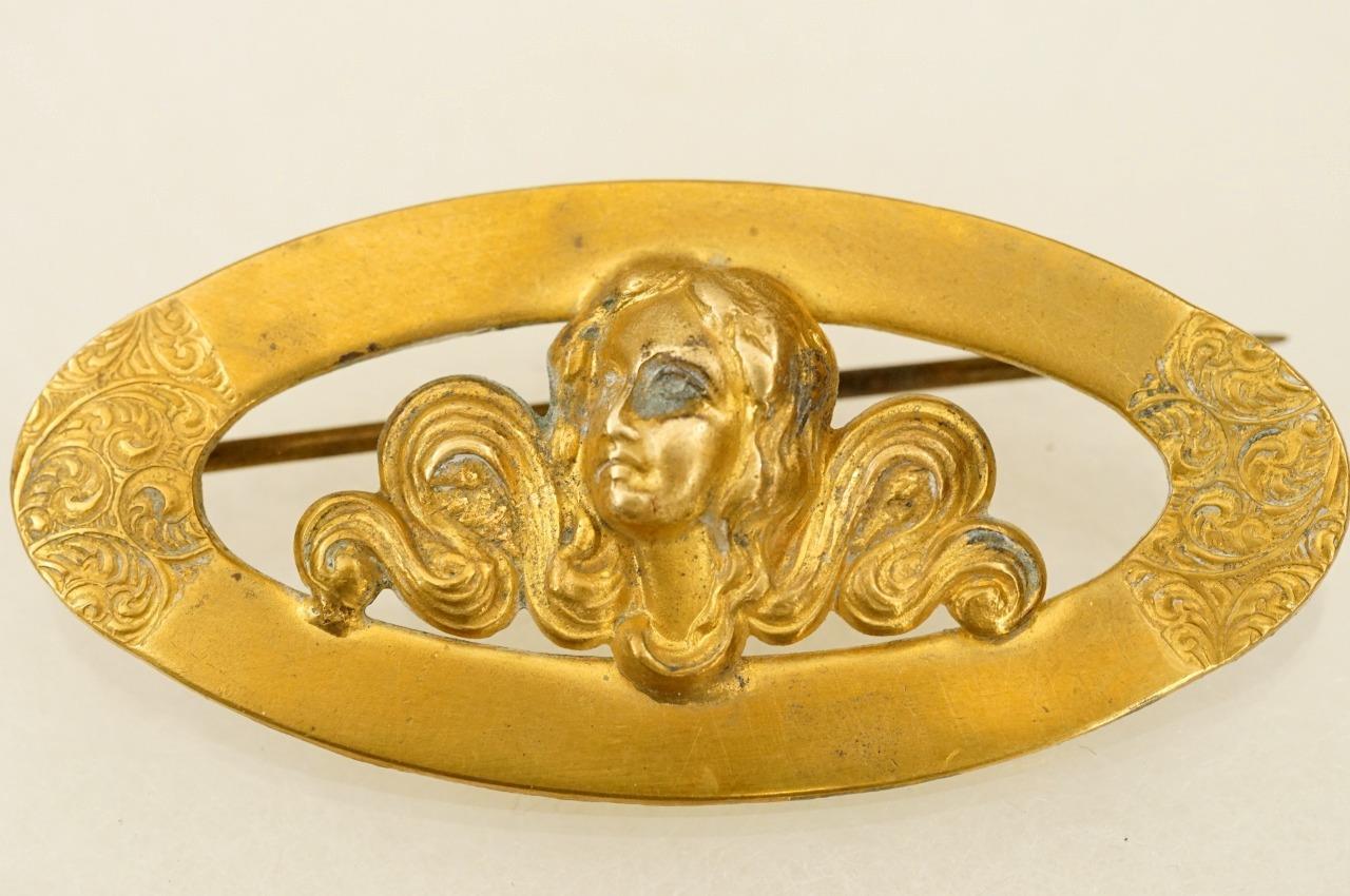 Vintage Costume Jewelry Art Nouveau Cameo Lady Brass Oval Brooch Pin