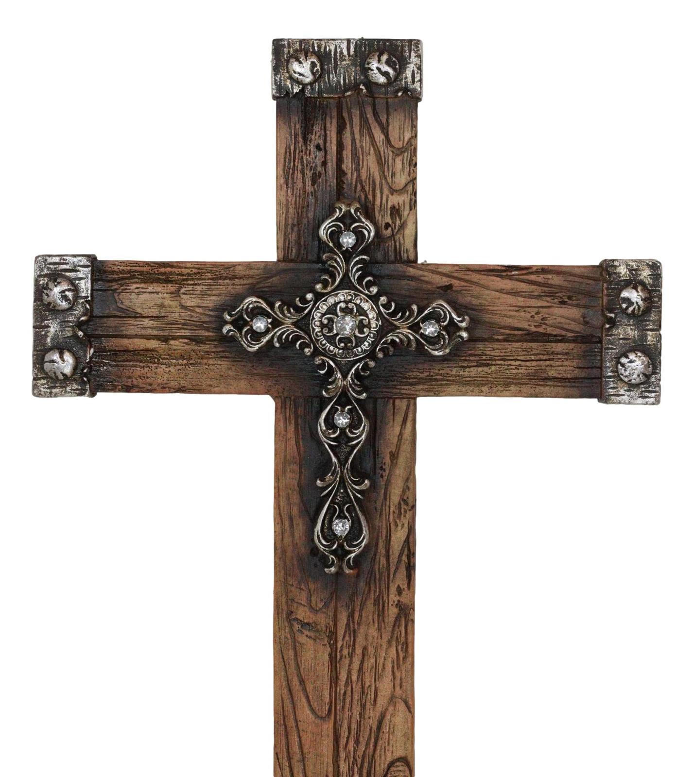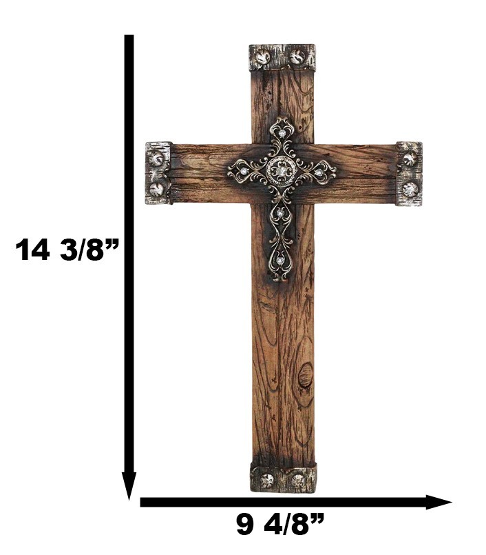Rustic Western Faux Wood Grain With Layered Silver Scroll Crystals Wall Cross