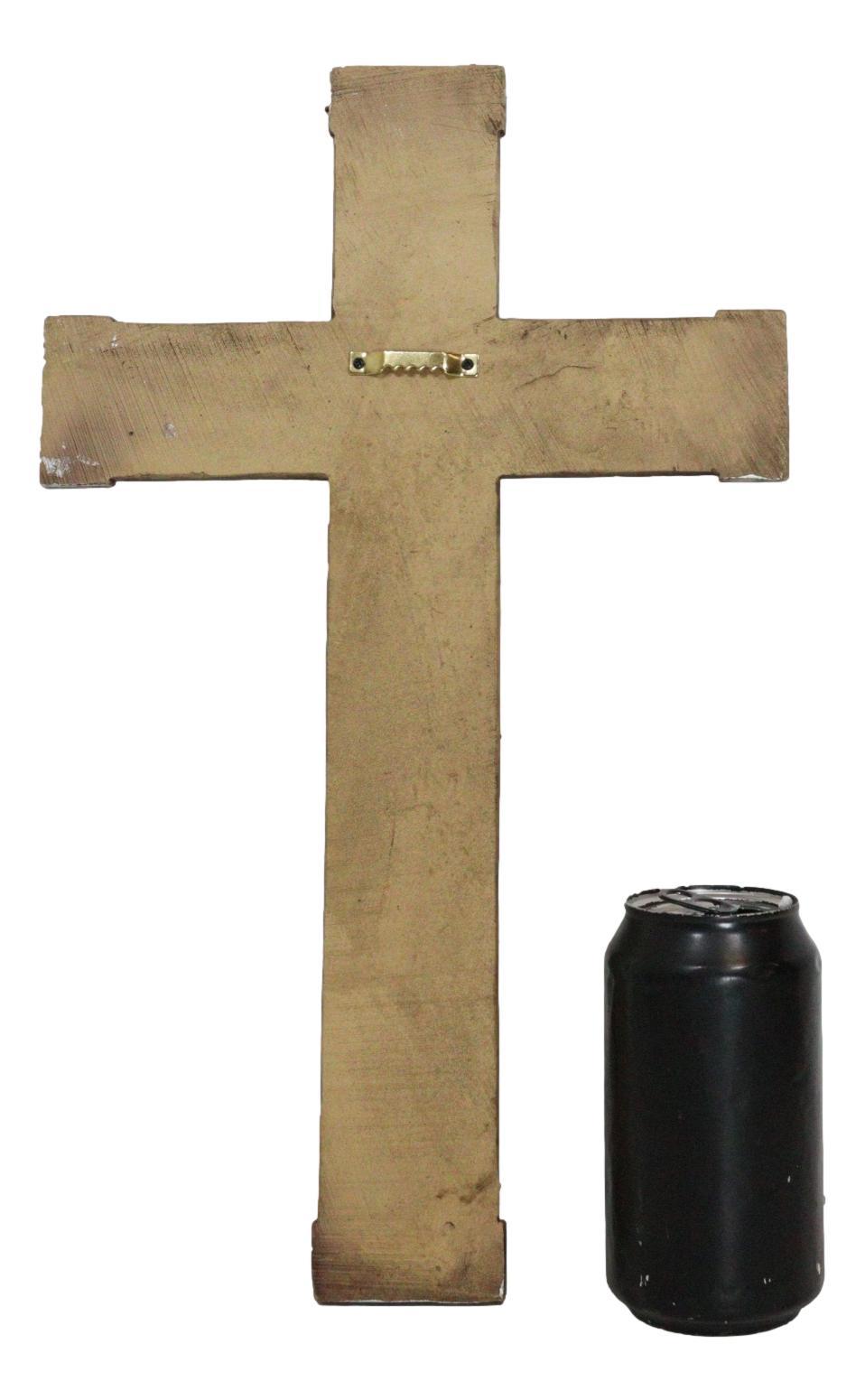 ? This Faux Wooden Layered Wall Cross Sculpture measures 14.25" High, 9.5" Wide and 0.5" Thick approximately. It weighs about 1.5 pounds.